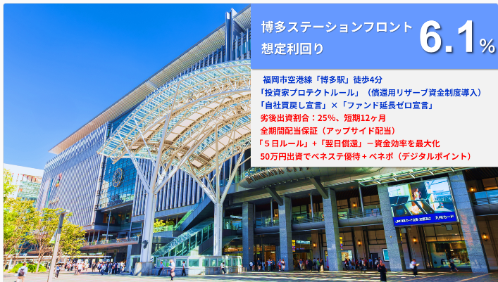 特徴:博多駅徒歩4分、敗者復活ルールあり、全期間配当保証、ベネステ優待、らくたまポイ活(年間2万円相当ポイント還元)など。